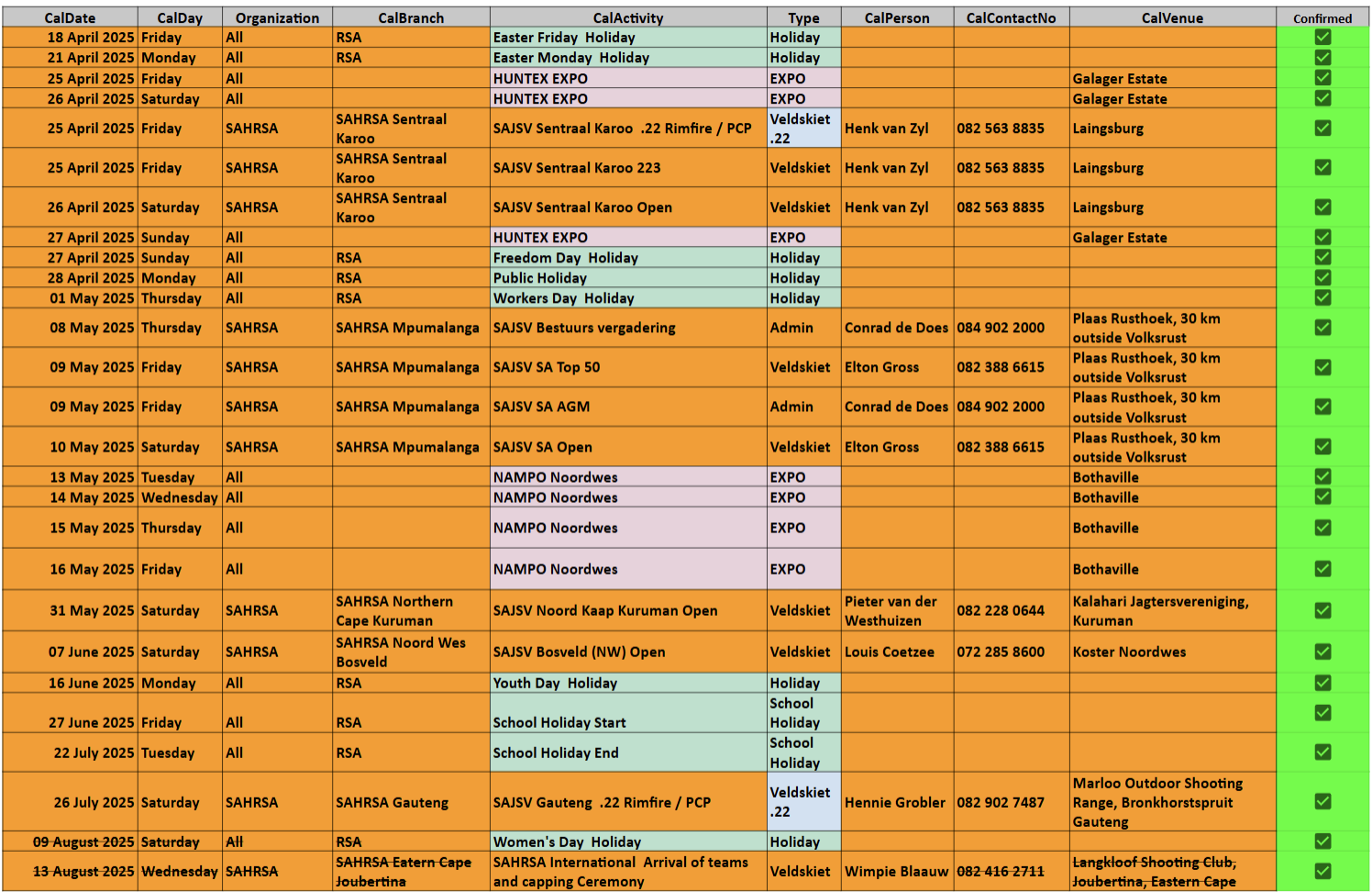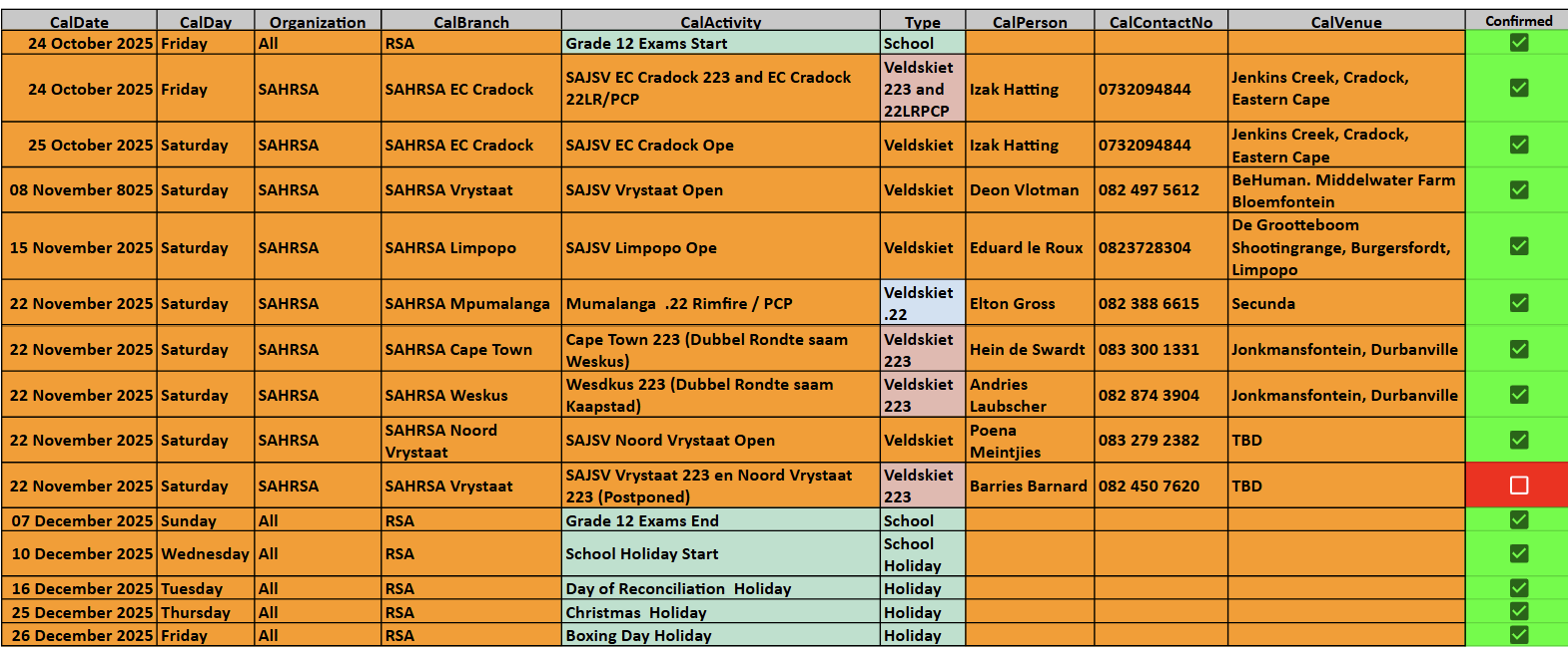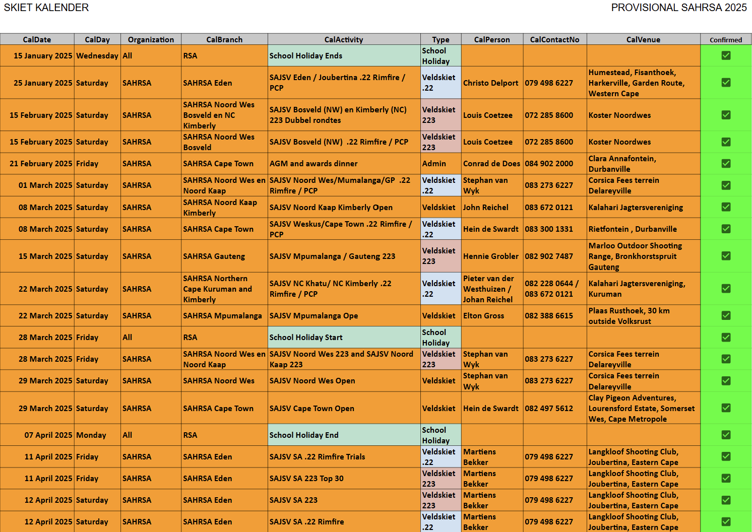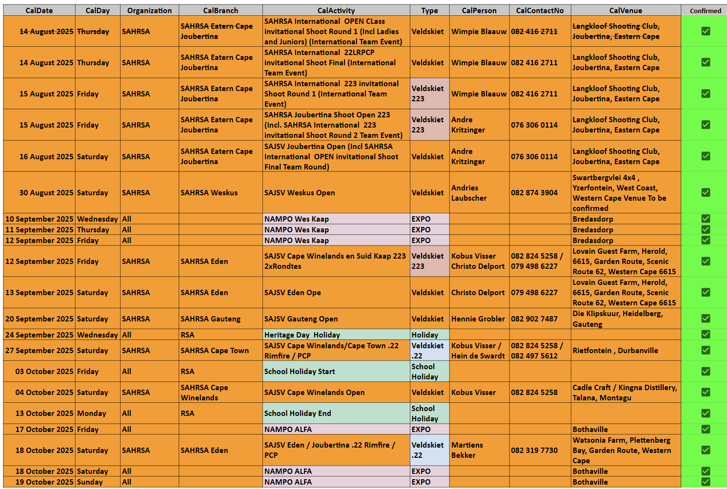 SAJSV Datums - 2025 - Dates SAHRSA (PROVISIONAL RELEASE) (Updated 2 October 2025 Note: dates and venues subject to finalization of programs)New updated : Freestate Open 8 November , Northern Freestate 22 November 2025New updated : 22LRP events Eden/Joubertina 18 October 2025New updated : New Limpopo Open is back, Saturday, 15th of November 2025 , De Grootteboom Shootingrange near BurgersfordtNew updated : Cradock 223 and a Cradock 22LRPCP event, Friday, 24th of October 2025 , Karoo Safaris CradockNew updated : Postponed until later notice - Freestate 223 and Open 1-2 August 2025 |