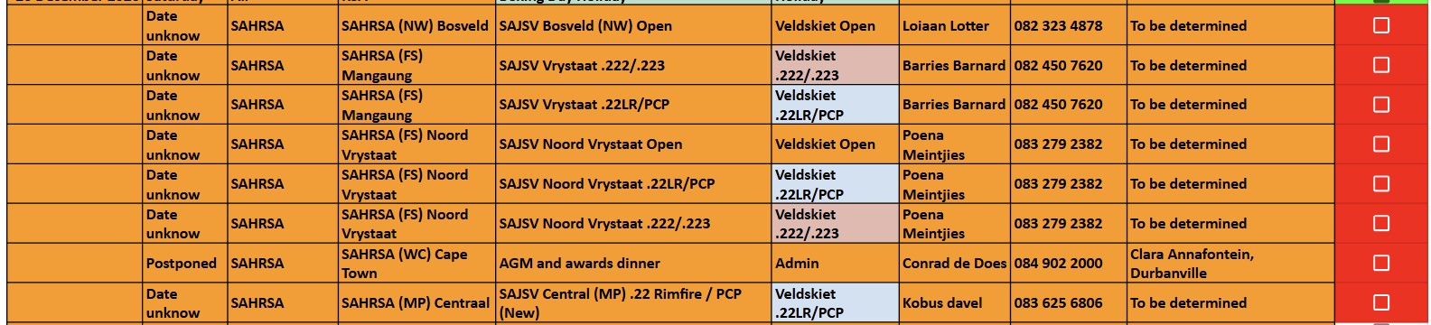 SAJSV DATUMS SAJSV Datums - 2026 - Dates SAHRSA (PROVISIONAL RELEASE update 5 March 2026)New updated : 2026 Provisional calender release. Contact your local organiser /district manager for queries and details relating to local events.New updated : Date changed 11 April 2026 Kuruman (NC) 223, Word gehou in Kimberley New updated : Date changed 21 March 2026 Kuruman (NC) 22LR, Kalahari Jagter Kuruman New updated : Date changed 25 July 2026 Cape WInelans (Boland) (WC) 222/223 and 22LR, Robertson New updated : Date changed 12st September 2026 Eden (WC) 222/223 and 22LR, Louvaine