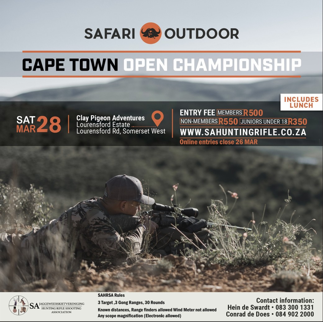 SAFARI OUTDOOR Cape Town Open Online Entries Open SAHRSA Mpumalanga South Open 2026 Online entries Open SAHRSA Mpumalanga Suid 22LR/PCP Inskrywings Oop SAHRSA Mpumalanga South 223 2026 Online entries open SAJSV Noord Kaap Kuruman 22RIM Aanlyn inskrywings Oop SAJSV Mpumalanga Sentraal 223 Inskrywings Oop |