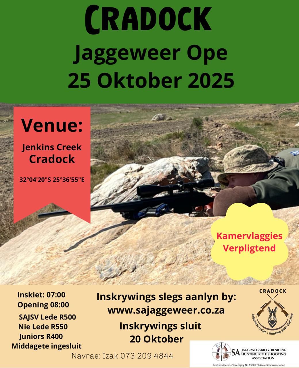 Cradock Jaggeweer Ope aanlyn inskrywings Oop![]() >>AANLYN INSKRYWINGS OPE Hier<<LET OP U MOET APART INSKRYF VIR DIE 22LR, 223 en Opes>>AANLYN INSKRYWINGS 222/223 Hier<<