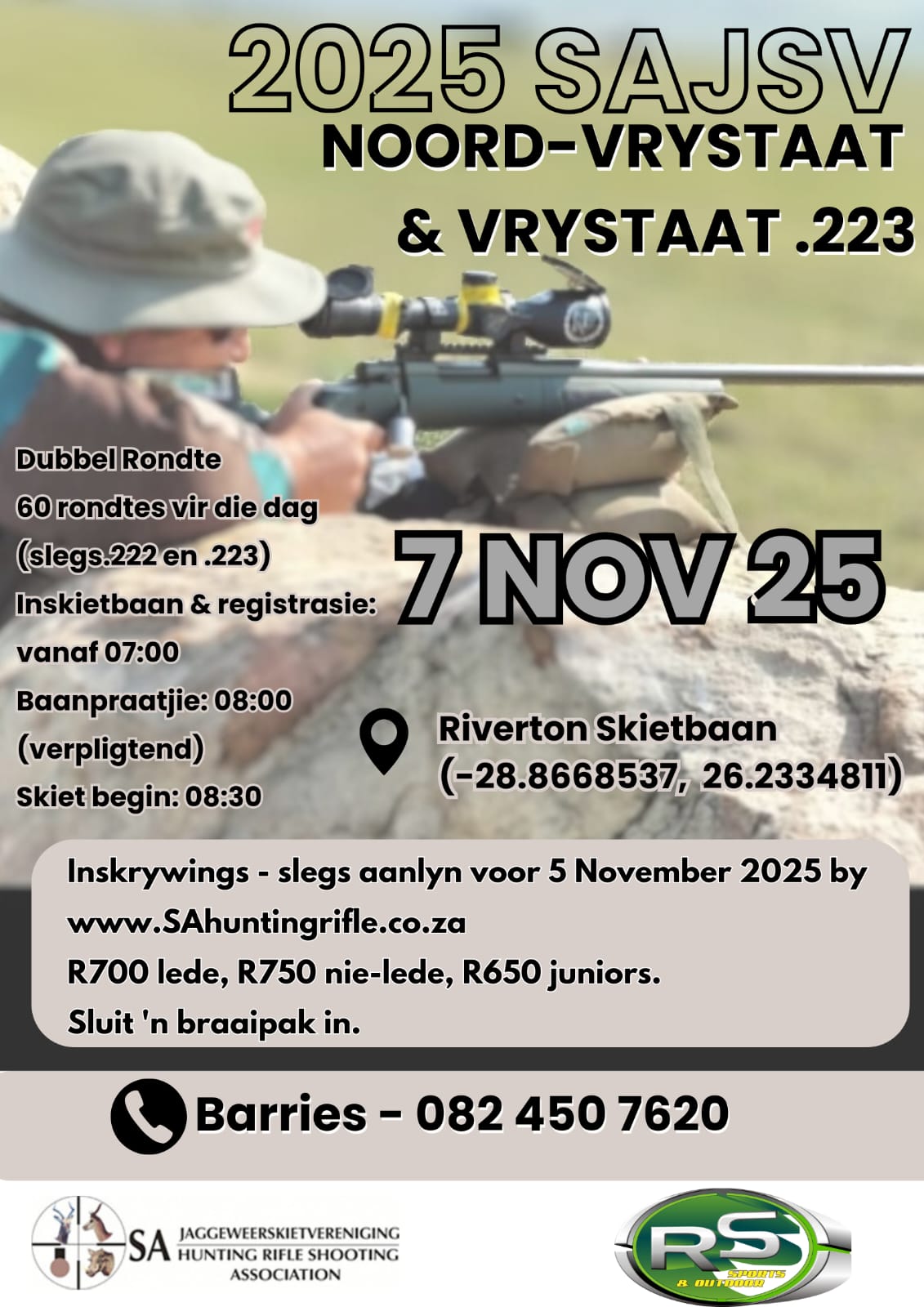RS Sports Vrystaat Ope 2025 Inskrywings oop RS Sports Free State , Northern Free State 223 Aanlyn inskrywings oop Cradock Jaggeweer Ope aanlyn inskrywings Oop Cradock Jaggeweer 223 en 22LR aanlyn inskrywings Oop Eden/Joubertina .22 Rimfire/PCP Online entries open League Fees Registration and joining - Do it here online |