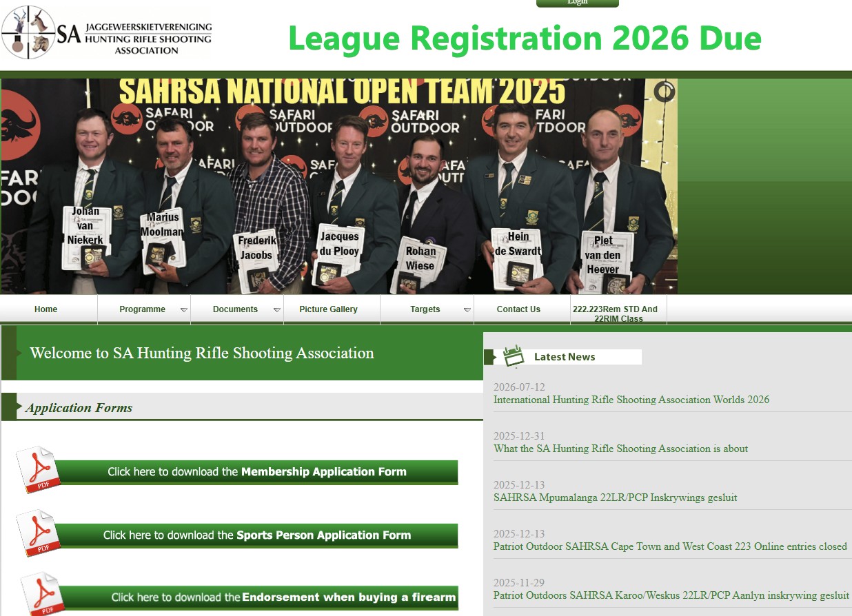What the SA Hunting Rifle Shooting Association is about Liga Jaargeld Registrasie en aansluiting 2025 - Doen dit aanlyn hier International Hunting Rifle Shooting Association Worlds 2026 SAHRSA Kers en Nuwejaars Groete South African Institute for Drug-Free Sport SA Huntingrifle Facebook Page |
