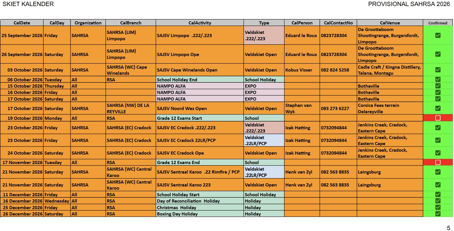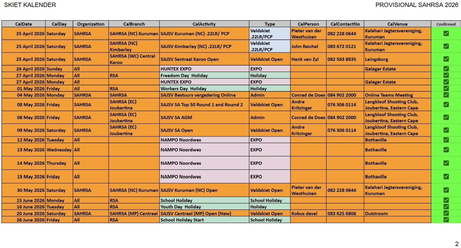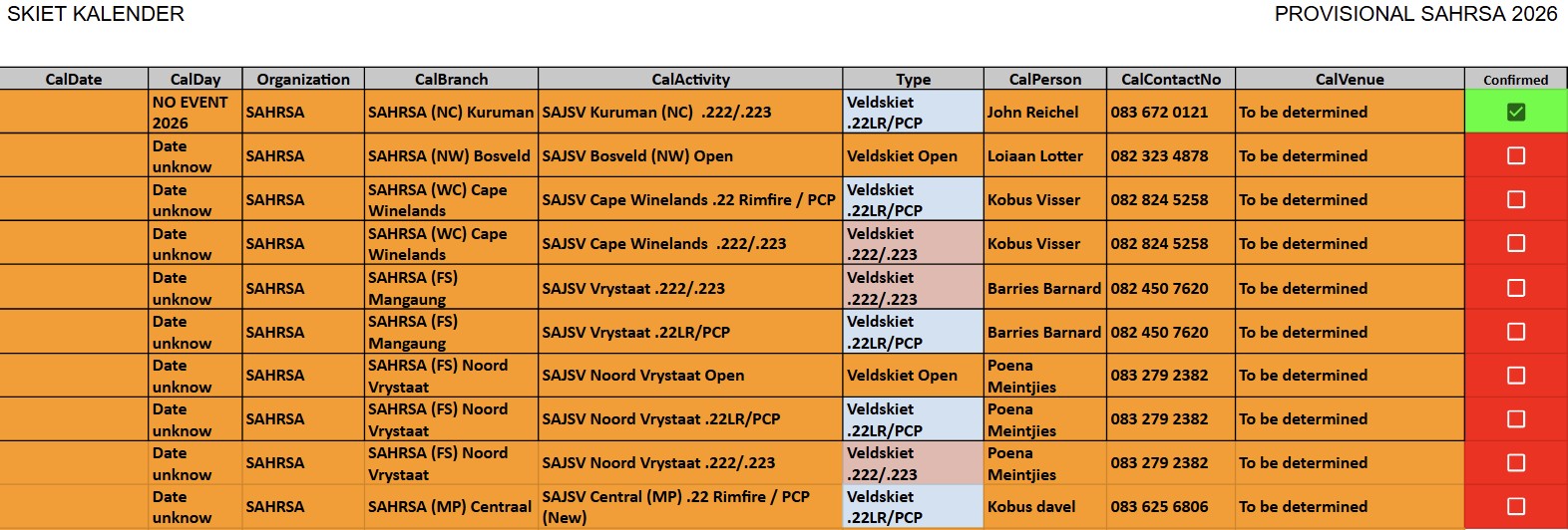 SAJSV DATUMS SAJSV Datums - 2026 - Dates SAHRSA (PROVISIONAL RELEASE update 25 January 2026)New updated : 2026 Provisional calender release. Contact your local organiser /district manager for queries and details relating to local events.New updated : Date changed 21st February 2026 Bosveld (NW) 222/223 and 22LR, venue to be confirmed New updated : Date changed 21st April 2026 Kuruman (NC) en Kimberley (NC) 22LR, Kalahari Jagters