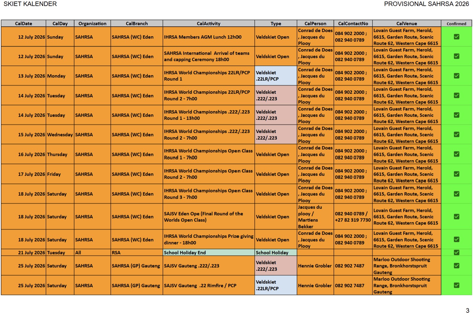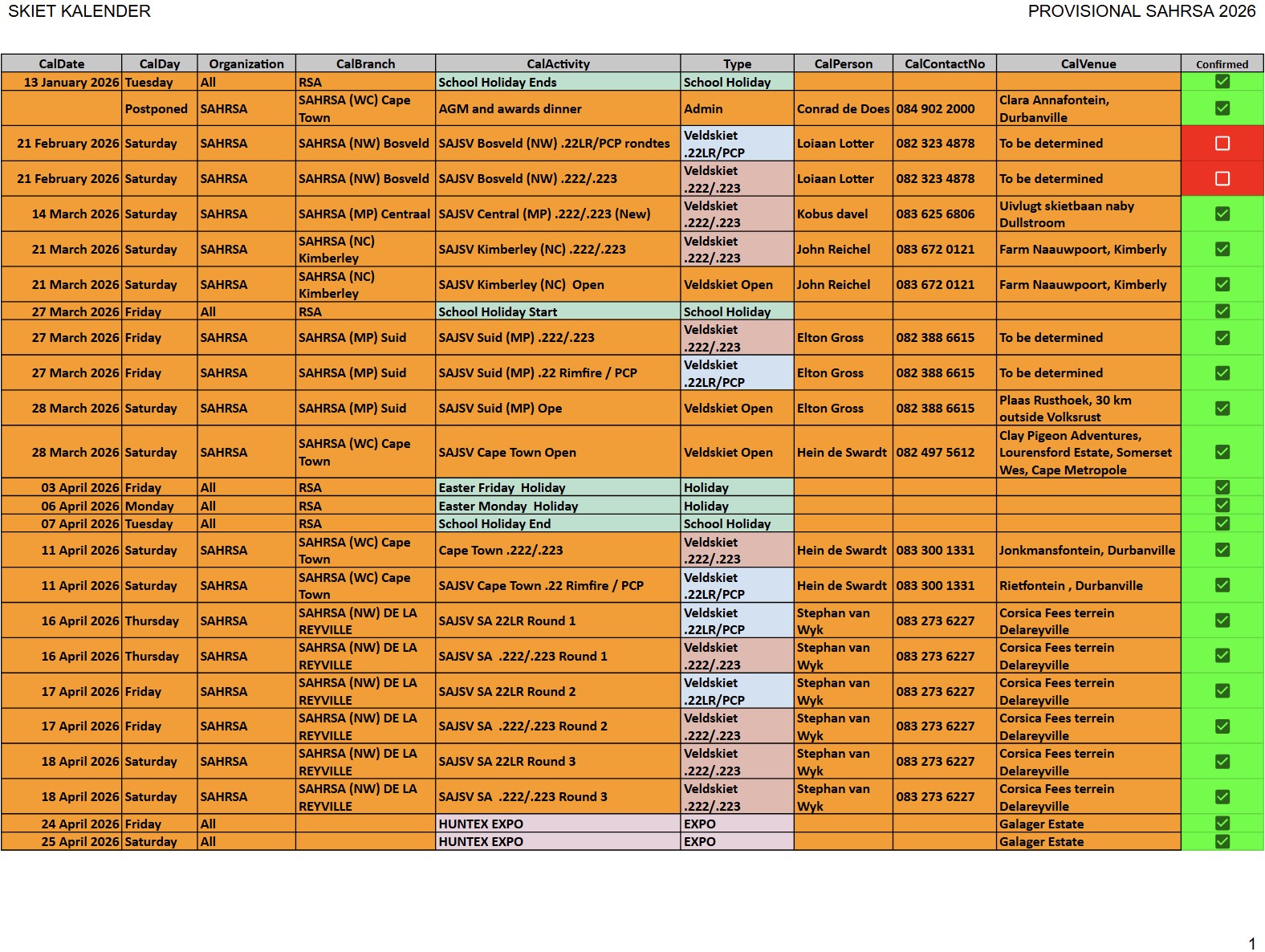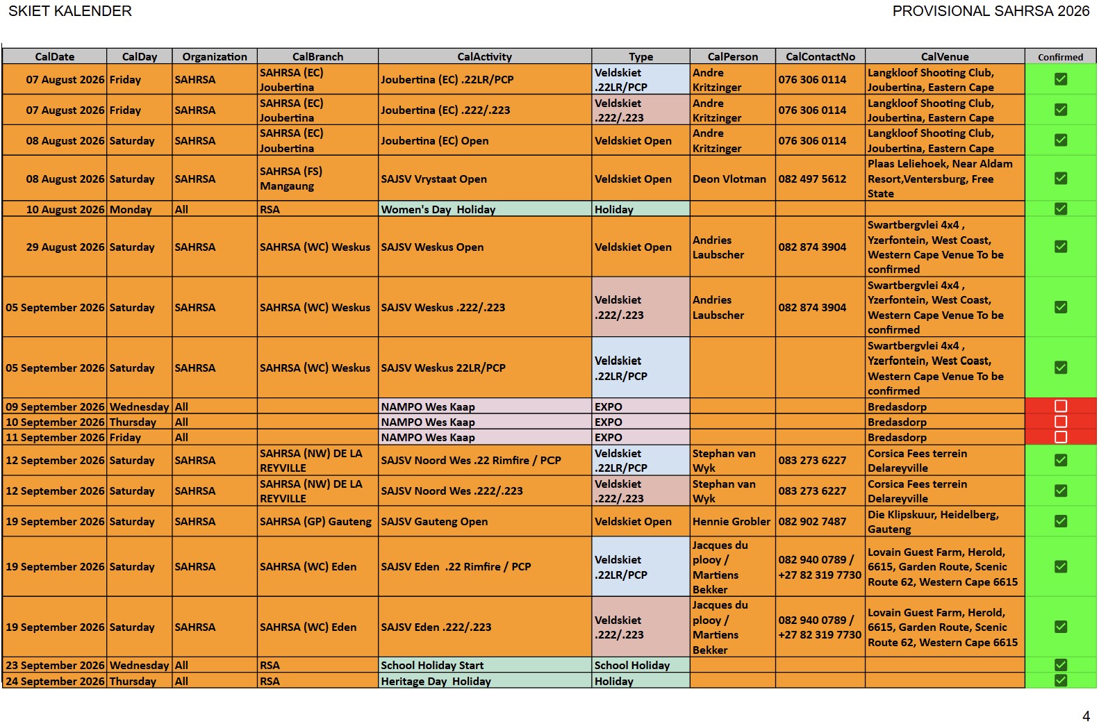 SAJSV DATUMS SAJSV Datums - 2026 - Dates SAHRSA (PROVISIONAL RELEASE update 25 January 2026)New updated : 2026 Provisional calender release. Contact your local organiser /district manager for queries and details relating to local events.New updated : Date changed 21st February 2026 Bosveld (NW) 222/223 and 22LR, venue to be confirmed New updated : Date changed 21st April 2026 Kuruman (NC) en Kimberley (NC) 22LR, Kalahari Jagters