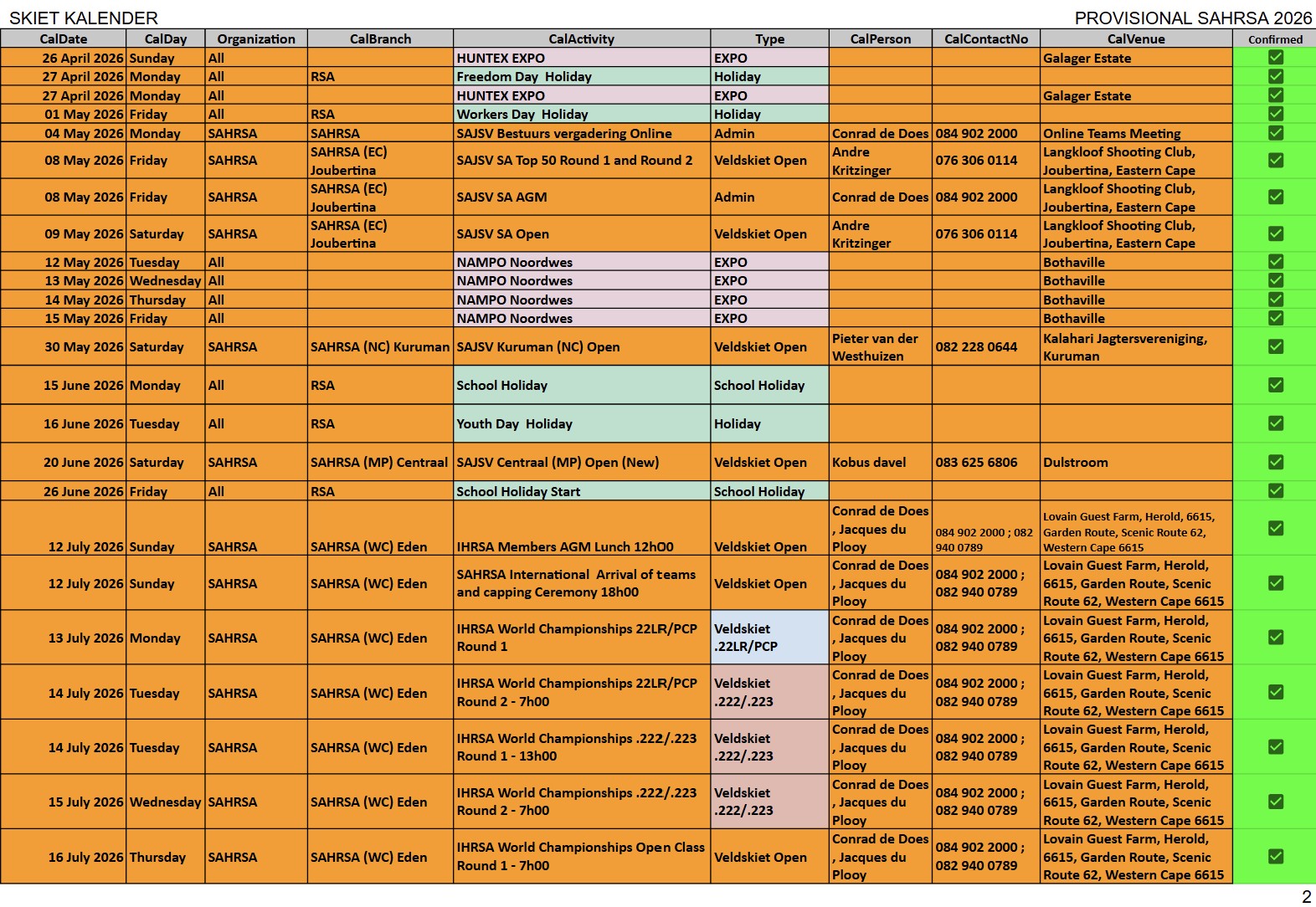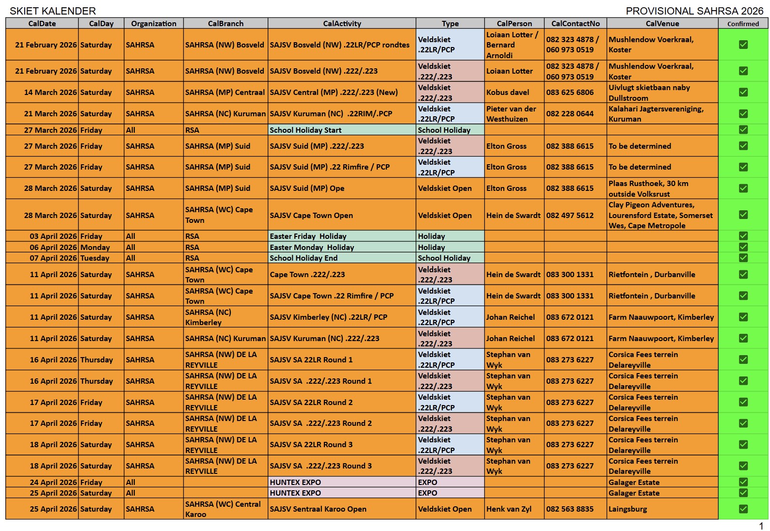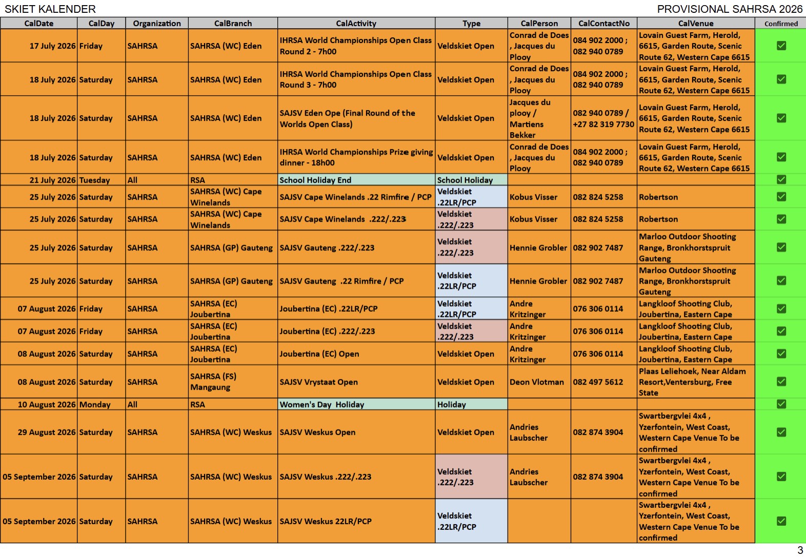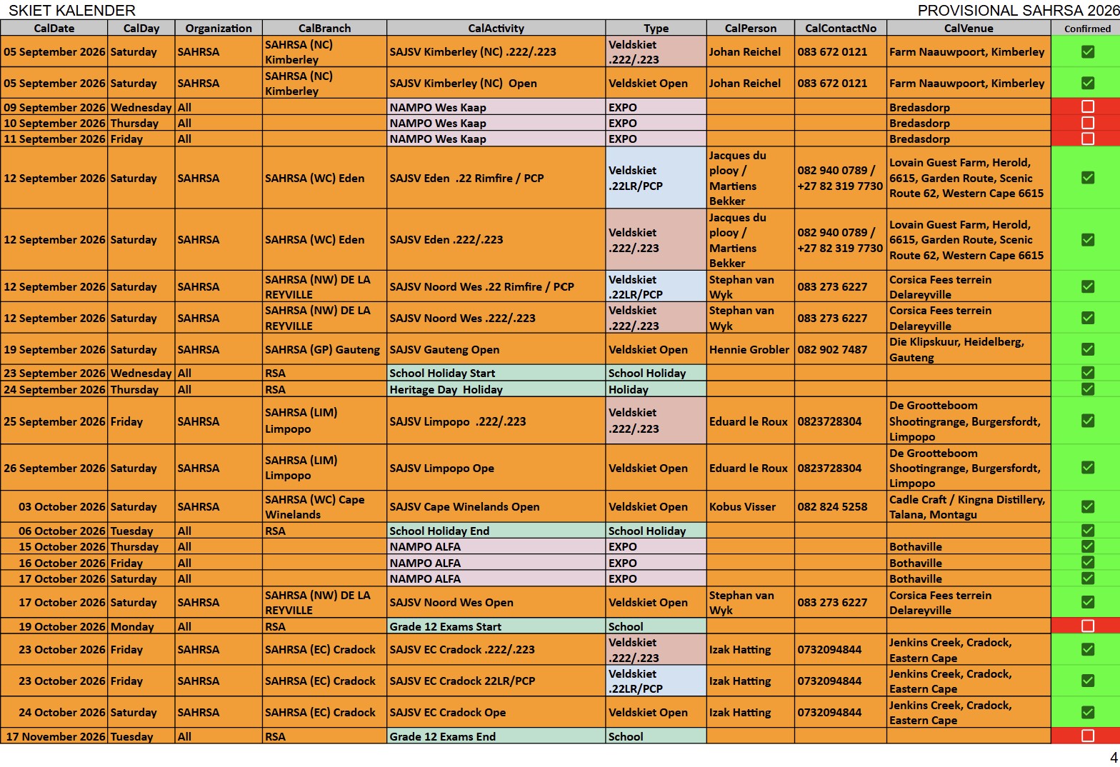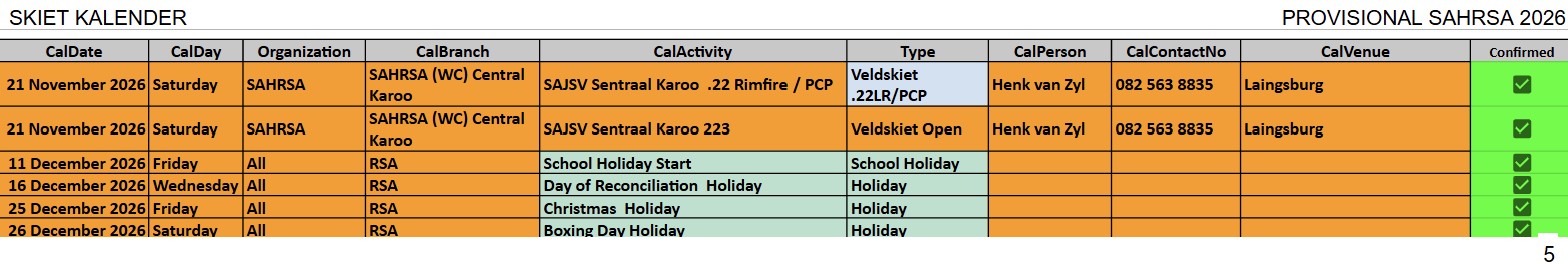 SAJSV DATUMS SAJSV Datums - 2026 - Dates SAHRSA (PROVISIONAL RELEASE update 5 March 2026)New updated : 2026 Provisional calender release. Contact your local organiser /district manager for queries and details relating to local events.New updated : Date changed 11 April 2026 Kuruman (NC) 223, Word gehou in Kimberley New updated : Date changed 21 March 2026 Kuruman (NC) 22LR, Kalahari Jagter Kuruman New updated : Date changed 25 July 2026 Cape WInelans (Boland) (WC) 222/223 and 22LR, Robertson New updated : Date changed 12st September 2026 Eden (WC) 222/223 and 22LR, Louvaine