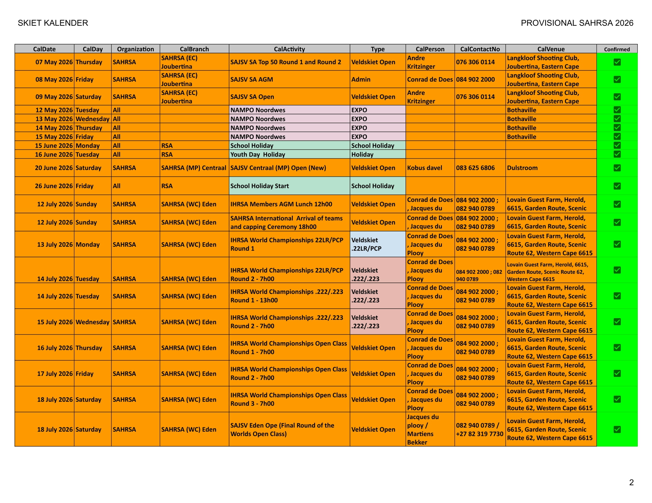 SAJSV DATUMSUpdated 19 November 2025 Note: dates and venues subject to finalization of programs)New updated : 2025 calender. NEW EVENT! 13th December 2025 Mpumalanga 22LR, Cape Town and West Coast 222/223 event addedSAJSV Datums - 2026 - Dates SAHRSA (PROVISIONAL RELEASE) New updated : 2026 Provisional calender release. Contact your local organiser /district manager for queries and details relating to local events.